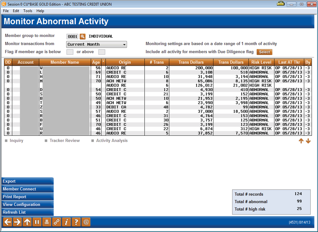 Use this time-saving tool to quickly identify abnormal or high-risk transactions according to the parameters set by your credit union. Use this screen to monitor abnormal activity for a number of member groups including regular members and commercial fiduciary, and to detect smurfing.