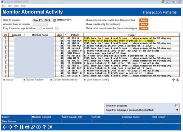 This software feature was developed for a number of reasons including the FFIEC’s Guidance letter on managing high-risk account activity, elder abuse, and low-level BSA and ACH activity. It goes hand in hand with the coding of member due diligence levels for the ongoing monitoring and detection of high-risk accounts.