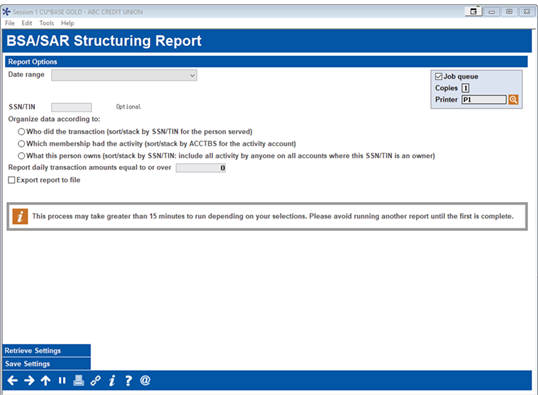 Access this report by selecting Tool #1990: Print BSA/SAR Structuring Report.