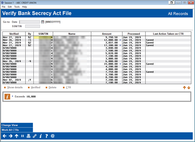 This is the techie way to manage your Bank Secrecy audit functions. The screen populates with the same data found on your daily BSA reports but gives you an online working queue and a way for you to electronically keep track of your verification process. You can even use this electronic log to transmit CTRs to FinCEN—no retyping required!