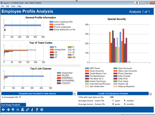 This screen shows summary statistics and graphs of key employee security settings, for all of your credit union’s active and archived employee IDs.