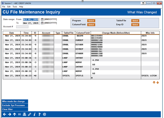 This dashboard is use monitor file maintenance activity made by various programs throughout the CU*BASE system. Data from the CUFMAINT file is displayed with the most current activity at the top.