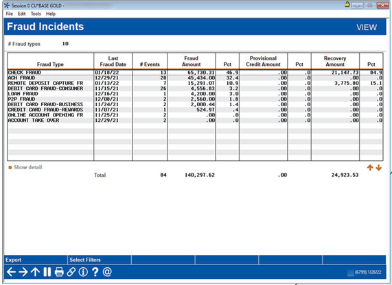 At one push of a button your Chief Financial Officer (CFO) can instantly see how much and what types of fraud is affecting the credit union. This dashboard gives them vital information in determining additional loss mitigation controls to put in place to limit future losses.
