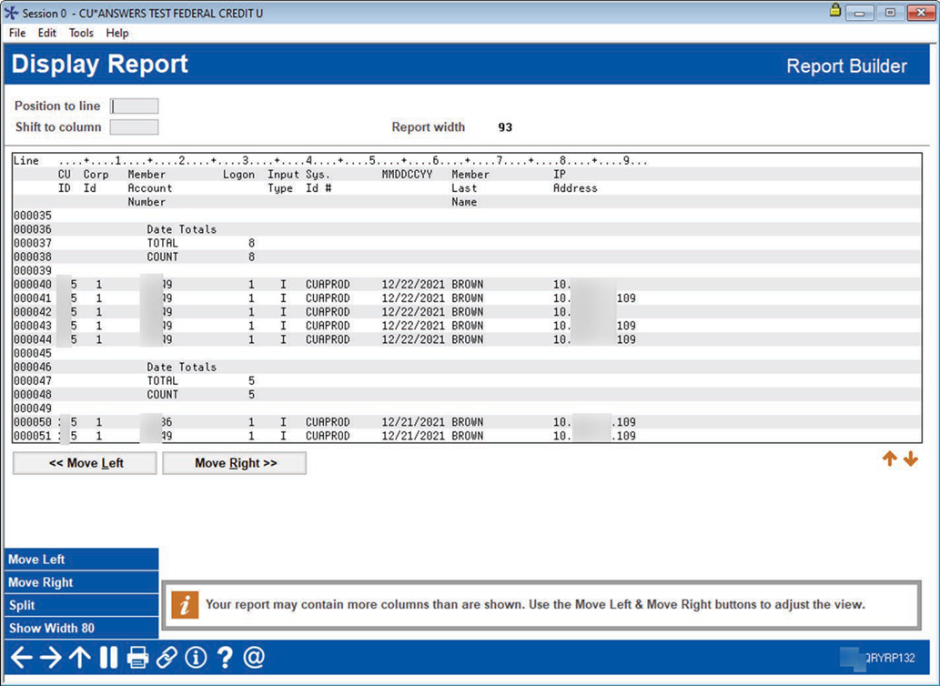 The Online Banking and Audio Response Detail Statistics tool uses IBM Query to produce a display showing all member activity using online banking. Use this to crucial information relating to where the log on occurred.